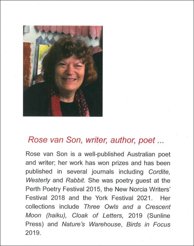 My poetry encompasses a love of nature, history, family, art: a way of seeing and understanding. I write with sound in mind. In all my writing – essays, articles, fiction – meaning is only half without poetry. I seek out others’ poetry, to learn from and enjoy. Cadence, music, rhythm, sound: so important to me. I value the simple word; how it fits with a deeper understanding. My collections include: Cloak of Letters, Nature’s Warehouse, and Labyrinth in Sandfire.